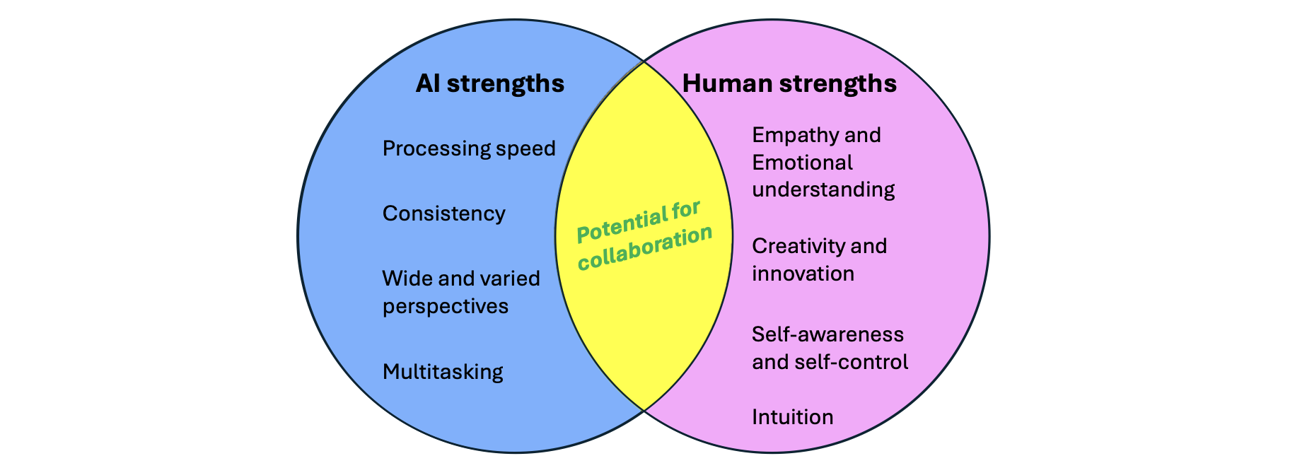 AI strengths + Human strengths Different but complementary strengths : when combined correctly and at the right time, these forces can enhance creativity.